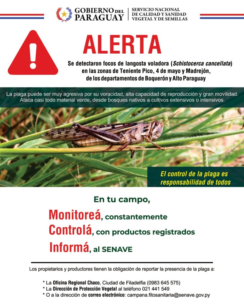 Para denuncias o consultas relacionadas con la presencia de langosta voladora, se pueden utilizar los siguientes contactos: Oficina Regional Chaco (0983-645-575), Dirección de Protección Vegetal (02-441-549) o correo electrónico campana.fitosanitaria@senave.gov.py.