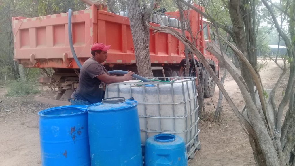 Filadelfia,RCC.- La distribución se realizó por medio de camiones volquetes y una moto bomba, para así asistir especialmente en el llenado de tanques reservorios del vital líquido y mitigar los impactos que generan la situación climática.