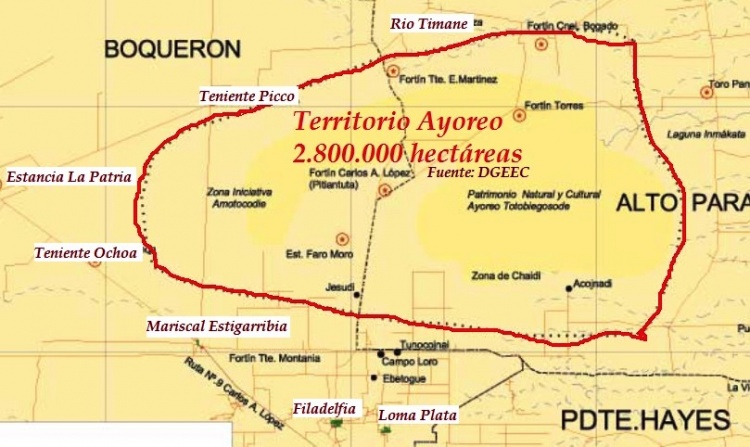 Como puede verse, se trata de un vasto territorio de casi 30.000 kilómetros cuadrados en el que existen poblados, unidades militares, establecimientos agroganaderos, caminos, tendido de servicios y hasta un parque nacional completo. Según la oenegé Iniciativa Amotocodie, el territorio original ayoreo comprendía 11.000.000 de hectáreas…
