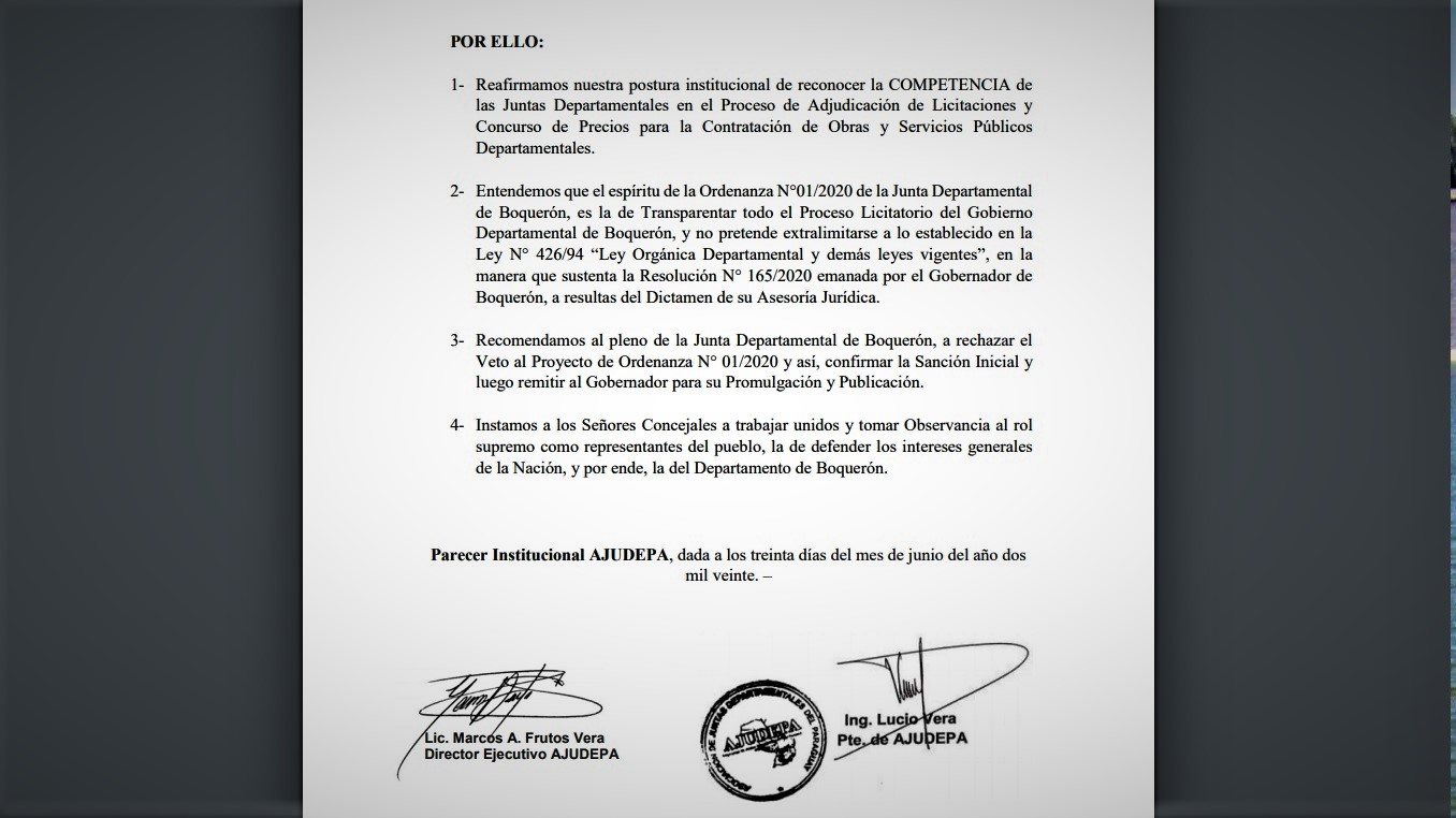 En dicho informe, la AJUDEPA fundamentándose en la Constitución Nacional del Paraguay; la Ley Orgánica Departamental N° 426/94; y la Resolución DNCP N° 1890/2020, reafirma su postura institucional de reconocer la COMPETENCIA de las Juntas Departamentales en el Proceso de Adjudicación de Licitaciones y Concurso de Precios para la Contratación de Obras y Servicios Públicos Departamentales.