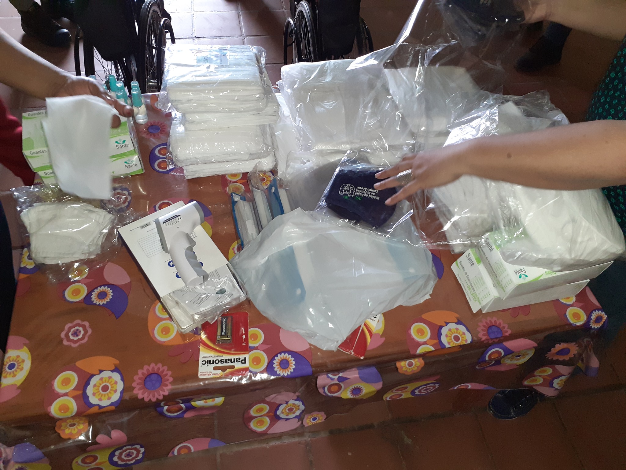 La donación consiste en: 6 batas, 200 tapabocas blancos más 10 personalizados, 20 frascos de alcohol en gel y en líquido, termómetro digital, 400 guantes, 2 sillas de ruedas, 10 máscaras acrílicas, 700 guaraníes en efectivo para la compra de agua, informaron desde la USF de Campo Aceval.