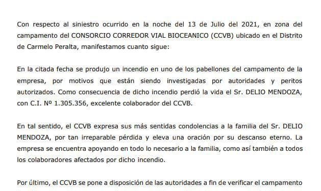Asimismo, desde la firma manifestaron su compromiso y colaboración con las autoridades y peritos forenses, para llevar adelante las investigaciones del siniestro que ocurrió en la noche del 13 de julio en el campamento ubicado en la progresiva 214+100.