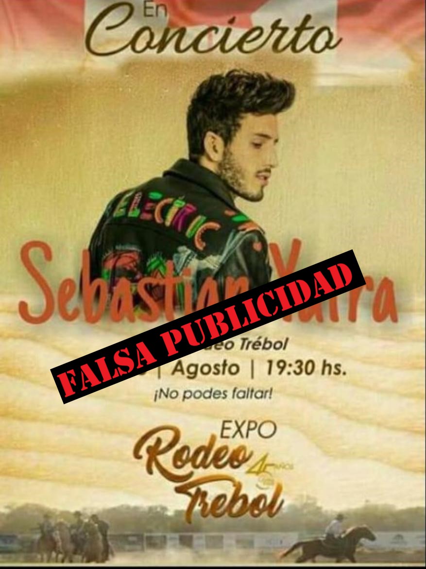 Filadelfia, RCC.- El afiche que recorre masivamente en redes anuncia un concierto de Sebastián Yatra durante el desarrollo de la edición número 45 de la Expo Rodeo Trebol. La Asociación desea aclarar que el concierto es totalmente falso a modo de prevenir falsas expectativas en el público.