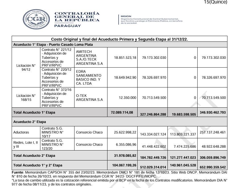 Los contratos firmados para la construcción del Acueducto Primera Etapa —Puerto Casado–Loma Plata— fueron modificados una y otra vez, mediante resoluciones emitidas fuera de plazo, sin respaldo técnico válido y en abierta contravención a la ley y a las propias Condiciones Generales y Especiales del Contrato.