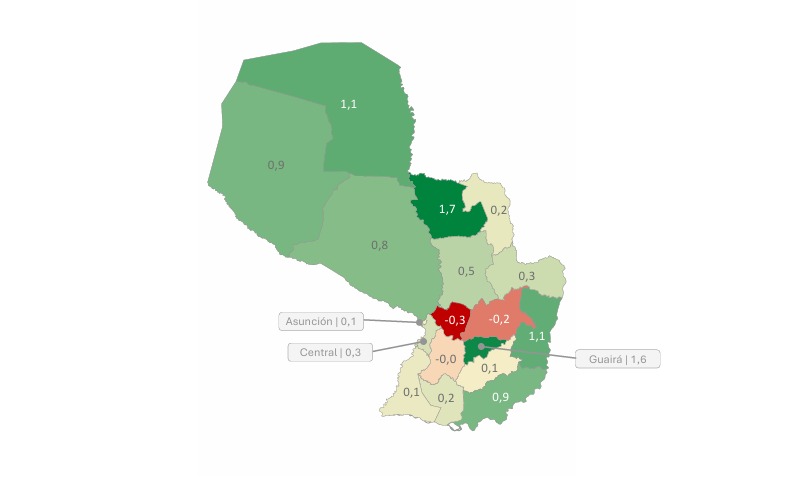 Aporte al Crecimiento: El departamento de Alto Paraguay, ubicado en el Chaco Boreal, demostró un impacto significativo al contribuir con 1,1 p.p. al crecimiento del sector, igualando el aporte de Alto Paraná.