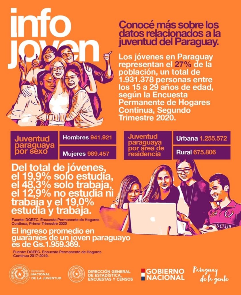Esta encuesta actualizada al segundo trimestre del año 2020 dice que los jóvenes representan el 27% de la población, es decir, unas 1.931.378 personas entre los 15 y 29 años de edad, de los cuales 989.457 son mujeres y 941.921 son hombres. Entre la juventud paraguaya, unos 1.255.572 viven en áreas urbanas y otros 675.806 en áreas rurales.