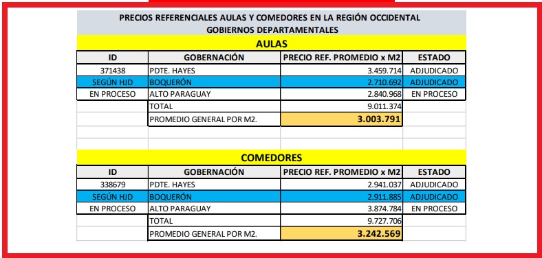 - a) Llamado de la Gobernación de Boquerón – Construcción de aulas con un costo promedio por m² de G. 2.710.692.