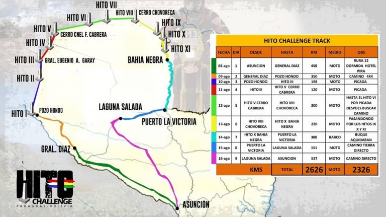 El trayecto tendrá una duración de 9 días, con 15 personas en motos de 450 cc tipo Dakar, partiendo de Asunción el 8 de agosto, siendo el mismo un itinerario sin precedentes, comentó Roger Careaga.