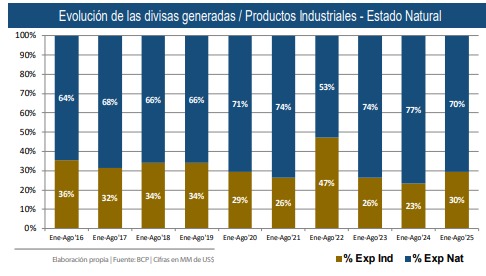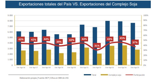 En materia de divisas, las exportaciones del complejo soja (granos y derivados) sumaron USD 2.808 millones a agosto, lo que equivale al 37% del total generado por el país, aunque representa una caída del 22% interanual por menores volúmenes y precios internacionales. No obstante, los productos industrializados aportaron USD 829 millones, el 30% del valor del complejo, cifra que mejora siete puntos porcentuales respecto al 2024.