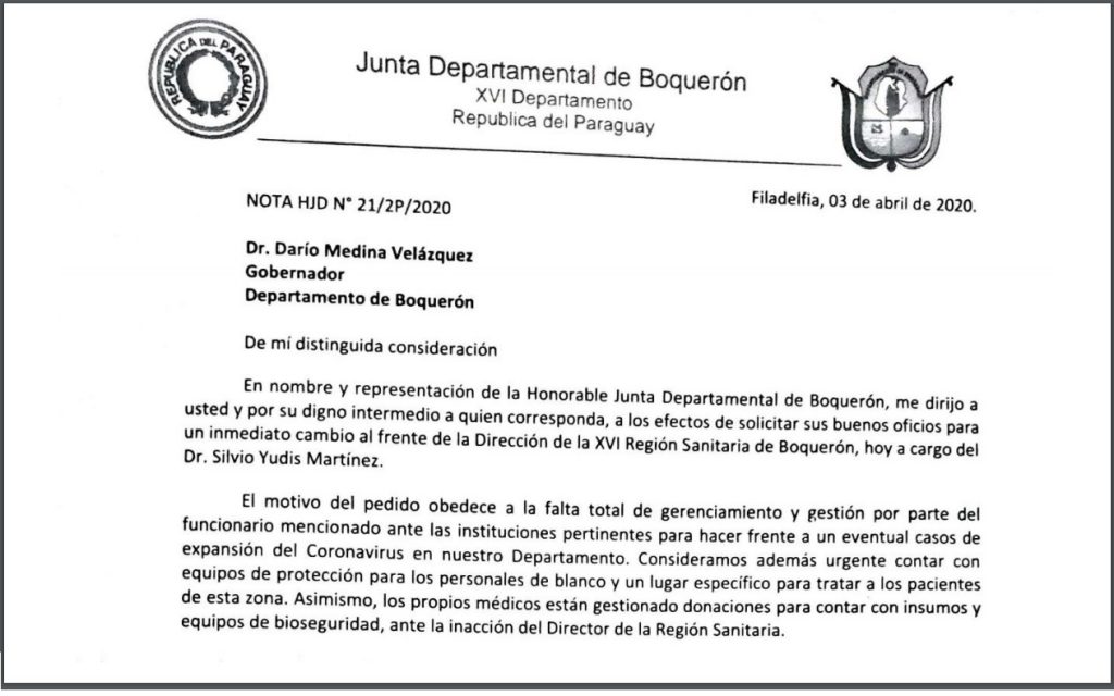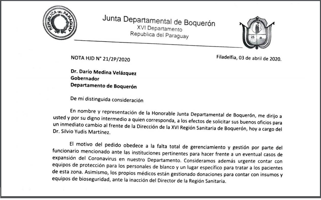Filadelfia, RCC.- Óscar Rodas, presidente de la Junta Departamental comentó que los concejales solicitarán al Gobernador Dr. Darío Medina y al Ministro Julio Mazzoleni para que tomen intervención en el caso de la renuncia del director del Hospital Regional, Dr. Orestes Menéndez, quien alegó falta de apoyo y respaldo de la Región Sanitaria.