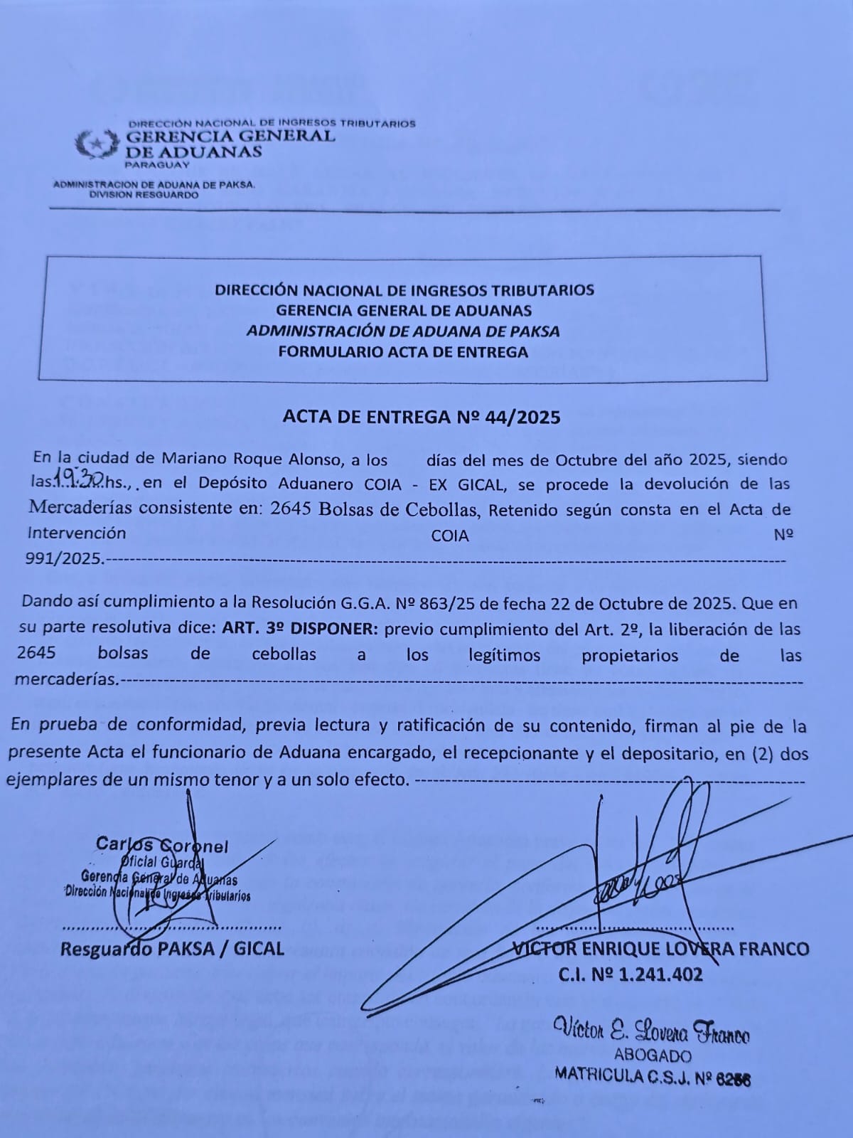 Luego de diez días del aparatoso procedimiento multiinstitucional, encabezado por la DNIT, que terminó en el decomiso de más de 3.000 bolsas de cebolla, producida en la Estancia la Última Esperanza, propiedad de la familia Hiebert, la institución procedió a devolver las mercaderías, que estaban retenidas en el depósito aduanero COIA (ex GICAL), ubicado en Mariano Roque Alonso, según consta en el Acta de Entrega N° 44/2025.