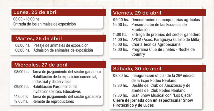 La expo iniciará el lunes 25 de abril con el primer ingreso de animales de exposición y se extenderá hasta el domingo 01 de mayo del 2022 con el acto de clausura oficial.