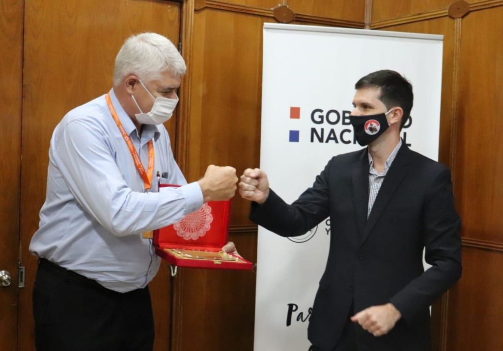Filadelfia, RCC.- Esta mañana a las 09:30 en Palacio de López los concejales departamentales hicieron entrega de la placa de reconocimiento a Mario Abdo Benítez y a las 10:30 al Arnoldo Wiens en la sede central del Ministerio de Obras Públicas y Comunicaciones. Pudieron estar los ediles Juan Carlos Irala, Mario Regier y Maura Recalde.