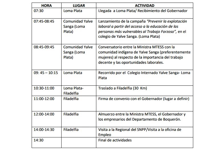Filadelfia RCC: El lanzamiento de la campaña “Prevenir la explotación laboral a partir del acceso a la educación de las personas más vulnerables al trabajo forzoso” se llevará a cabo este martes 19 de febrero, en la escuela de la Comunidad Indígena Yalve Sanga, estará presente la ministra de Trabajo, Carla Bacigalupo.