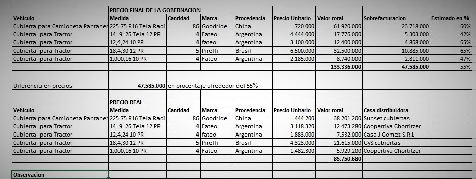 Afirmó que existen bastantes inconvenientes con las licitaciones convocadas desde la Gobernación, como por ejemplo un llamado para compra de neumáticos para maquinarias, en donde se evidenciaron precios aparentemente inflados.