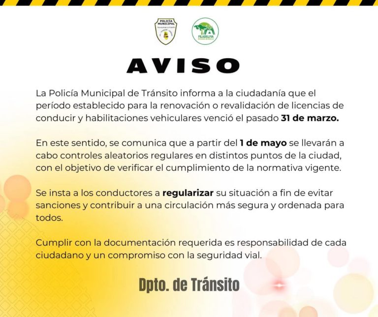 La Policía Municipal de Tránsito (PMT) de Filadelfia advirtió a la ciudadanía que el período establecido para la renovación o revalidación de licencias de conducir y habilitaciones vehiculares concluyó el pasado 31 de marzo, por lo que a partir del 1 de mayo se pondrán en marcha controles aleatorios en distintos puntos de la ciudad.
