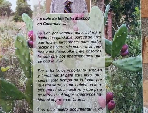 «La vida de los Toba Maskoy en Casanillo ha sido dura, sufrida y hasta desagradable, porque se tuvo que luchar largamente para poder recibir las tierras de nuestros ancestros y así desarrollar entre nosotros la vida que nos imaginábamos que podíamos vivir. Es importante y fundamental para este libro presentar este tiempo de lucha por nuestra tierra, la que habitaban también nuestros ancestros y que para nosotros es el hogar. Con esto quiero documentar la difícil lucha que tuvimos que pasar, tiempos sufridos, hasta finalmente poder recibir lo que era nuestro, legalmente ante el Estado Paraguayo», indicó.