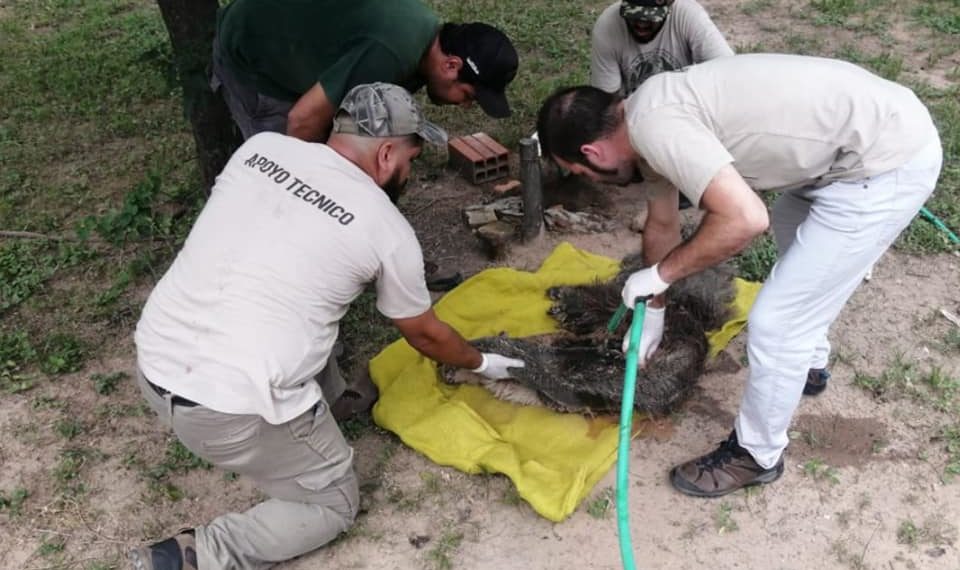 «Lo trajeron al refugio, donde procedimos a limpiarlo y revisarlo, constatando golpes varios y una posible fractura. Se procedió a una intubación con sonda para la primera alimentación a fin de estabilizarlo, y luego rayos X, donde se constato la fractura del fémur, que estaba inflamado también. Luego de una completa estabilización mediante alimentación con sonda, a los 8 días de haberlo recibido, la inflamación había bajado, y se le pudo hacer la cirugía correspondiente. Que yo sepa, nunca se hizo nada similar en Paraguay», explicó.