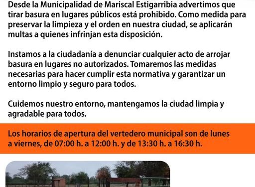 La Municipalidad de Mariscal Estigarribia ha emitido un aviso importante dirigido a todos los habitantes de la ciudad, recordando que está estrictamente prohibido tirar basura en lugares públicos. Con el fin de preservar la limpieza y el orden en la ciudad, se aplicarán multas a quienes no cumplan con esta disposición.