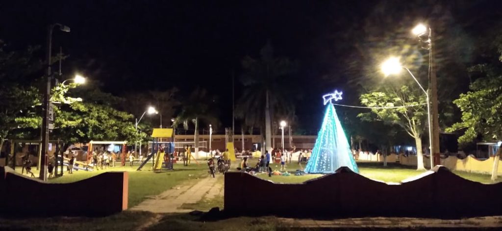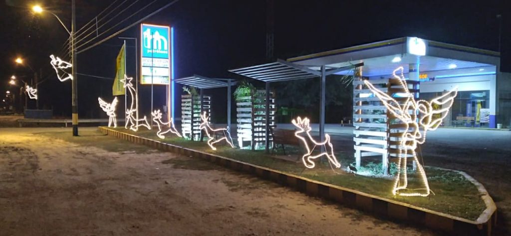 Alto Paraguay, RCC.- En la ruta de entrada de la ciudad se puede notar que el nuevo monumento de bienvenida a los transeúntes y visitantes fue adornado por el municipio con luces de colores, además ingresando un poco más hacia la avenida principal se puede notar también otras decoraciones con temática navideña.