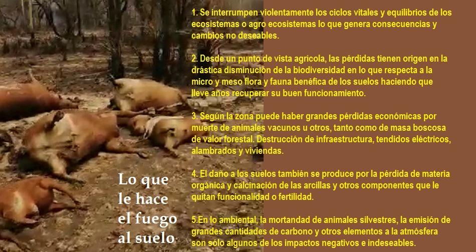 Los incendios degradan la estructura del suelo dejando más susceptibles a las erosiones y disminuyen considerablemente la fertilidad, llevando los suelos a un nivel de pobreza nutritiva importante.