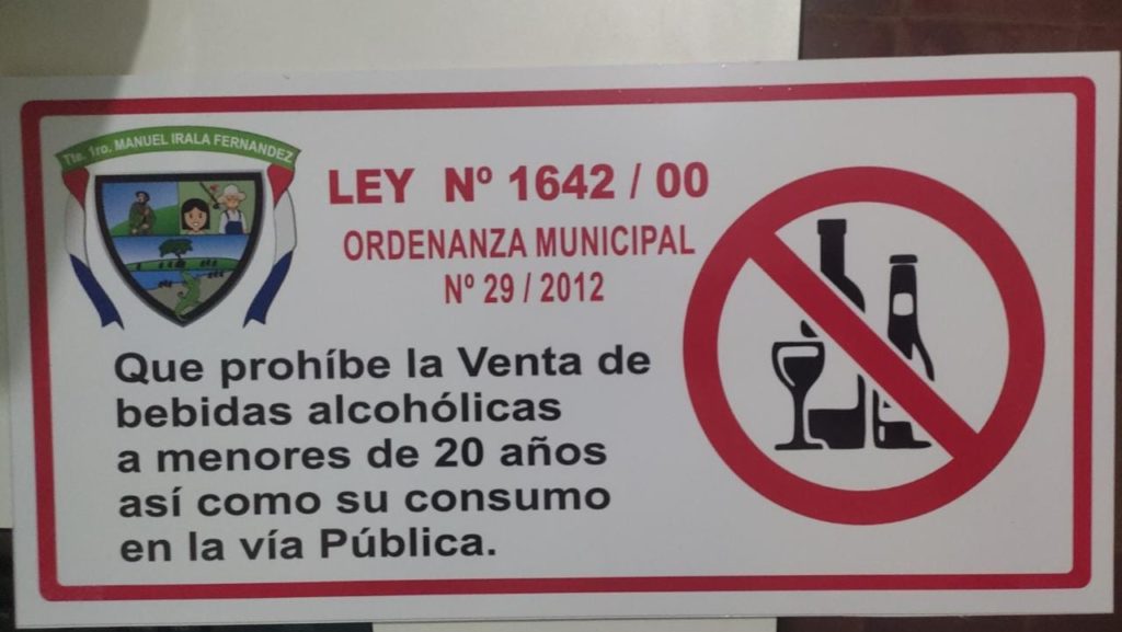 Es un hecho que muchas personas festejan emocionadas la navidad y la despedida del año. Sin embargo, el día de hoy, la Municipalidad de Tte. 1º Manuel Irala Fernández, recuerda a la ciudadanía mediante carteles, la prohibición de la venta de bebidas alcohólicas a menores de 20 años de edad y su consumo en la vía pública.