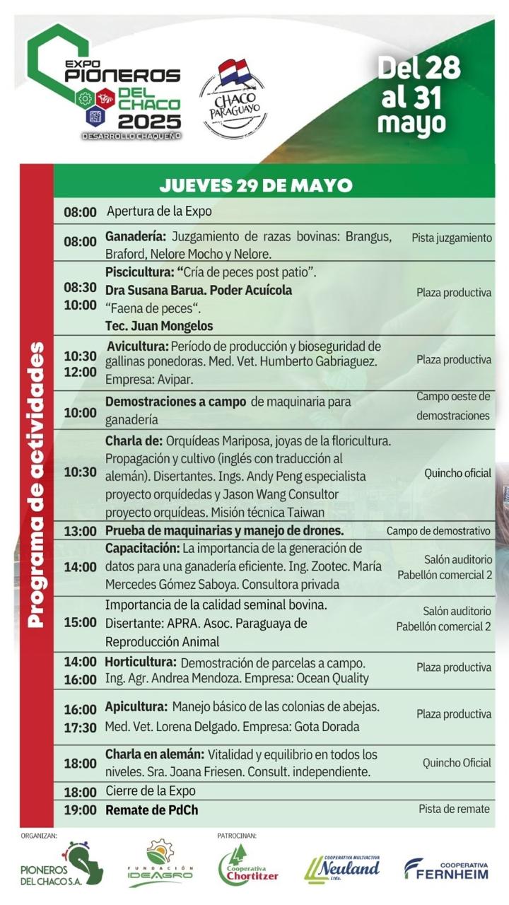 La Expo Pioneros del Chaco 2025 continúa este jueves 29 de mayo con su segunda jornada, reafirmando su papel como punto de encuentro estratégico para el desarrollo agropecuario en la región occidental del país. Desde temprano, el predio ferial se activa con un dinámico programa de charlas técnicas, demostraciones a campo, capacitaciones y exhibiciones de maquinaria.
