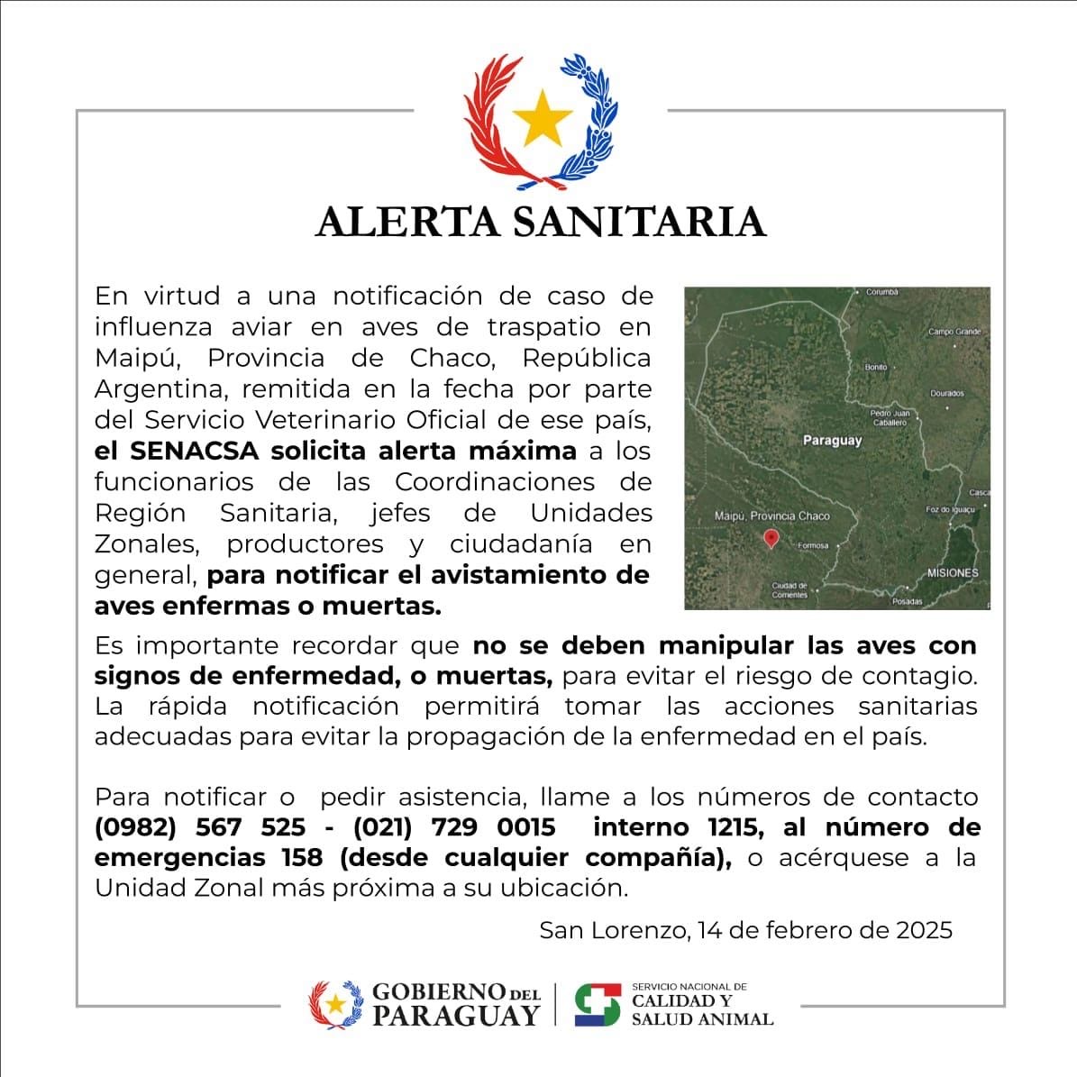 El Servicio Nacional de Calidad y Salud Animal (SENACSA) ha emitido un comunicado de alerta sanitaria luego de que el Servicio Veterinario Oficial de Argentina notificara la detección de casos de influenza aviar en aves de traspatio en la localidad de Maipú provincia de Chaco.