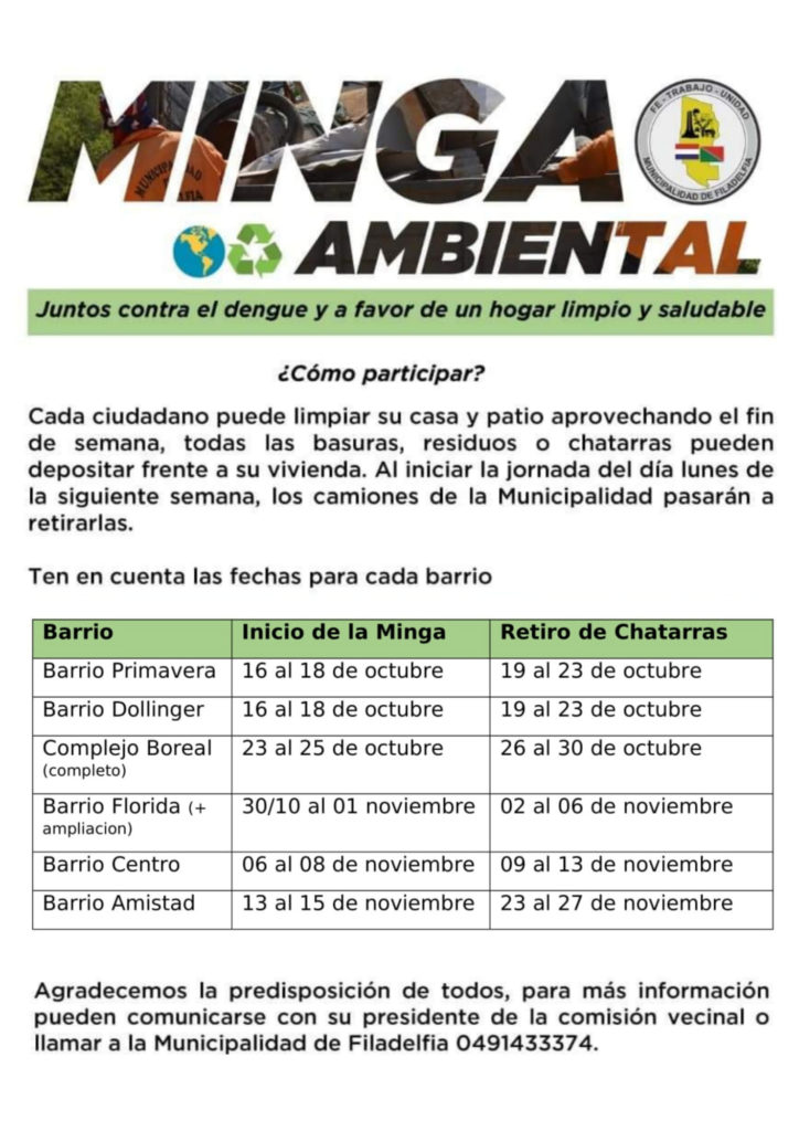 En Filadelfia se tiene un calendario de minga ambiental previsto para cada barrio, los residentes pueden aprovechar el fin de semana y realizar la limpieza de la casa, el patio y la vereda, juntando toda la basura y chatarras que durante la semana siguiente serán retirados por camiones de la municipalidad, de esta manera contribuyen todos.