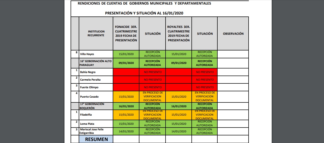 Por otro lado, los Gobiernos Departamentales sí cumplieron en tiempo y forma con sus obligaciones de rendición de cuentas, Presidente Hayes obtuvo la recepción autorizada de documentos el 13 de enero, Alto Paraguay por su parte lo hizo ya desde el 09 de enero y Boquerón recién en fecha 16 de enero.
