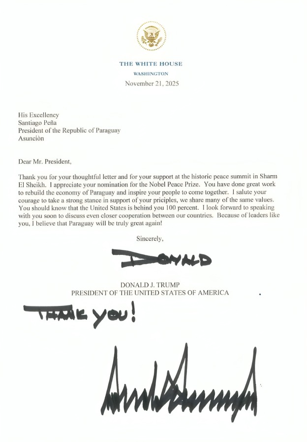 En la misiva, Trump agradece al mandatario paraguayo por su apoyo durante la denominada “histórica Cumbre de la Paz en Charles Sheik” y valora especialmente la nominación que Peña había realizado para el Premio Nobel de la Paz. El presidente estadounidense también elogia la gestión del jefe de Estado paraguayo, señalando que ha realizado “un gran trabajo para reconstruir la economía del Paraguay e inspirar a su pueblo a unirse”.