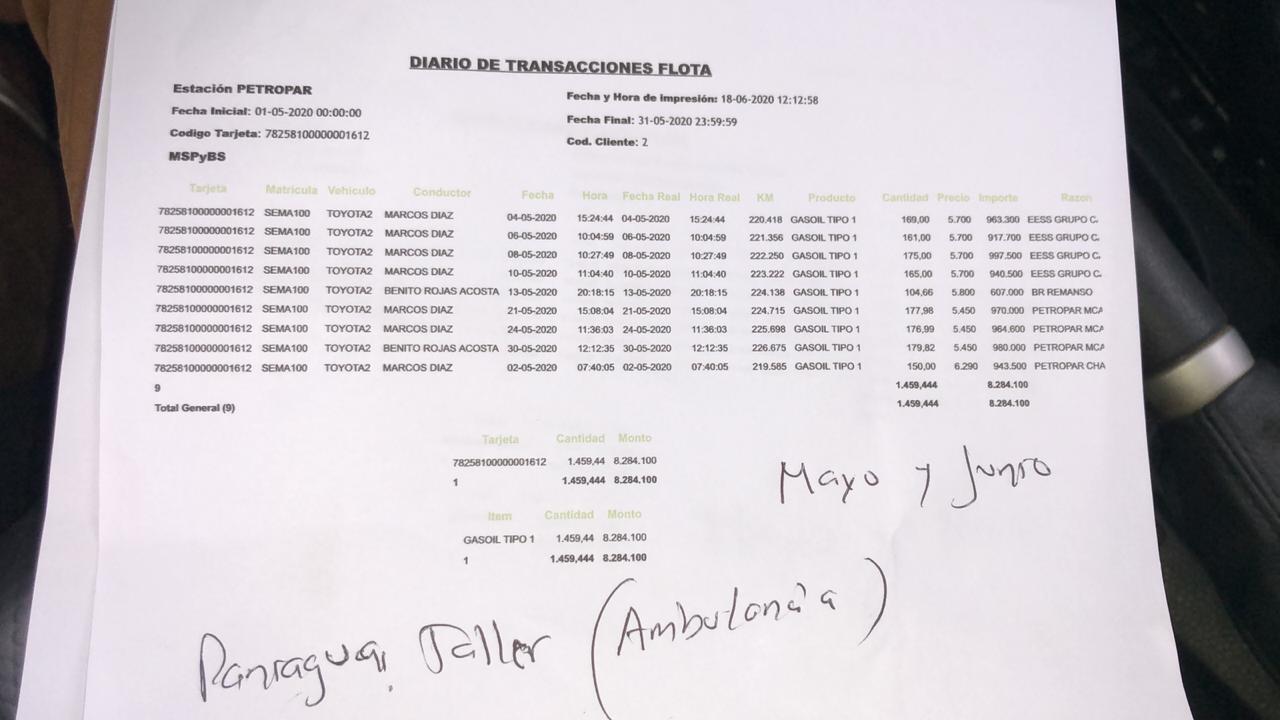 Una denuncia ciudadana fue presentada al ministro de Salud, Julio Mazzoleni, en referencia al expendio irregular de combustibles para ambulancias de la XVI Región Sanitaria, una de ellas recibió cargas por valor de G. 8.284.100 en el mes de mayo, mientras estaba sin ruedas ni motor. Mazzoleni destinó a representantes de la Dirección General de Anticorrupción y Transparencia para verificar las denuncias in situ el pasado 24 de junio del año 2020.
