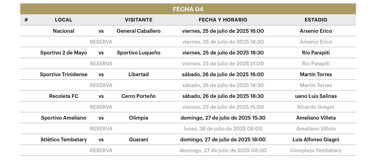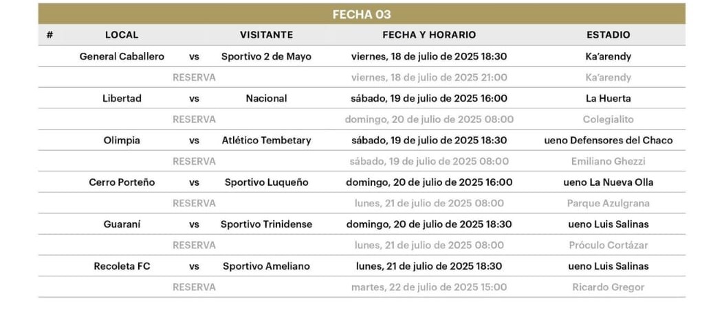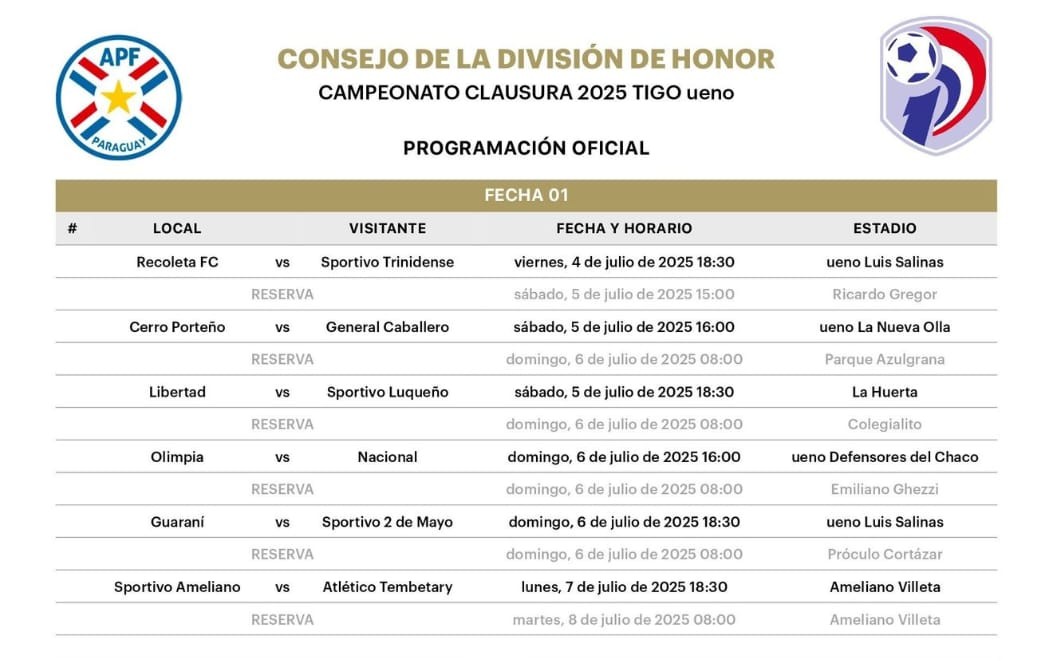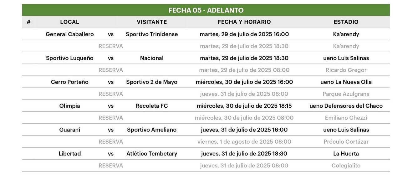 El domingo, Olimpia se trasladará al Defensores del Chaco, donde enfrentará a Nacional, mientras que Guaraní será local ante 2 de Mayo en Itauguá desde las 18:30. La fecha inaugural se cerrará el lunes 7 de julio en Villeta, con el cruce entre Ameliano y Tembetary.