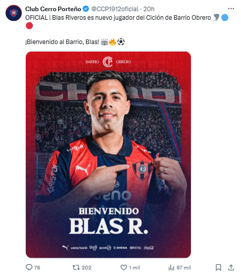 “Oficial. Blas Riveros es nuevo jugador del Ciclón de Barrio Obrero. ¡Bienvenido al Barrio, Blas!”, publicó la institución azulgrana en sus redes sociales, generando múltiples reacciones debido a su pasado en Olimpia, donde se formó y debutó profesionalmente.