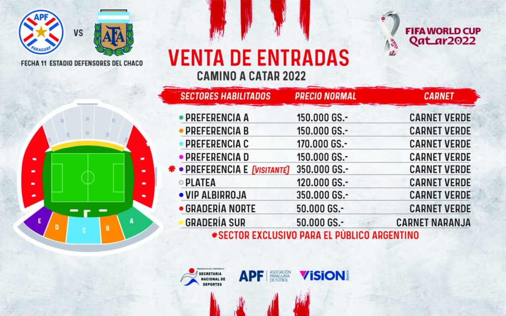 El precio de las entradas rondará desde las más baratas (50.000 gs. Graderías) a las más caras (350.000 Vip Albirroja) y se podrán adquirir en varios puntos de compra en las ciudades aledañas. Vale recordar uno de los requisitos a cumplir por los hinchas es tener el «Carnet Verde» de vacunación (dos dosis). No obstante, los que tengan una sola dosis o no están vacunados podrán ingresar a «Graderías Sur», único lugar del estadio destinado para los que tienen «Carnet Naranja».