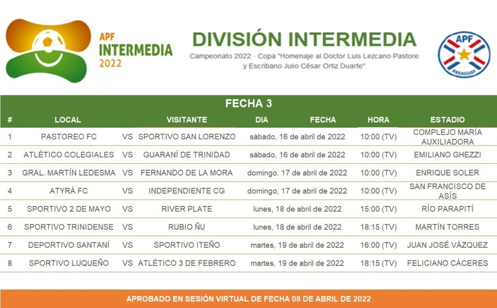 El episodio 3 se pondrá en marcha el sábado 16 de abril con dos partidos; en la ciudad de Minga Guazú se medirán Pastoreo FC vs Sportivo San Lorenzo, y en el barrio Palomar se enfrentarán Atlético Colegiales vs Guaraní de Trinidad. Ambos compromisos están marcados para las 10:00 horas. Recordemos que este viernes se estará disputando la segunda fecha de la División Intermedia, con los juegos: Independiente de Campo Grande vs Deportivo Santaní en el Ricardo Gregor y Rubio Ñu vs Sportivo Luqueño en La Arboleda.