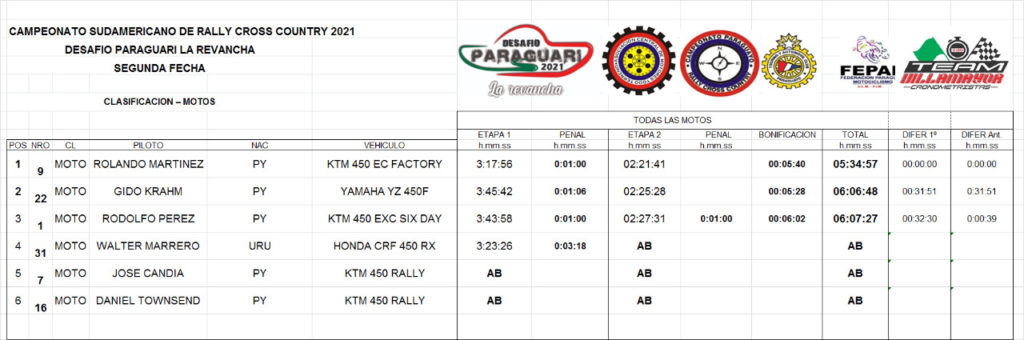 En la categoría Motos fue Rolando Martínez quien con su KTM 450 EC Factory, estableció un tiempo de 05:34:57 para colocarse al frente de la Yamaha YZ 450F de Gido Krahm a 31s51.