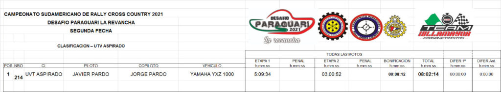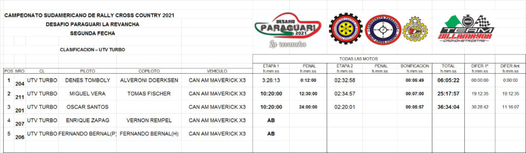 En los UTV turbo fue Denes Tomboly quien impuso condiciones con mucho tiempo de ventaja (19:12:35) por delante de Miguel Vera, ambos con el Can-Am Maverick x3. En tanto Blas Zapag siguió comandando el pelotón y terminó llevándose la victoria al mando de su Toyota Hilux con un tiempo de 05:27:33 por delante de Bruno Fiore, quien con el Toyota Fjcruiser quedó a 23s05 de distancia.