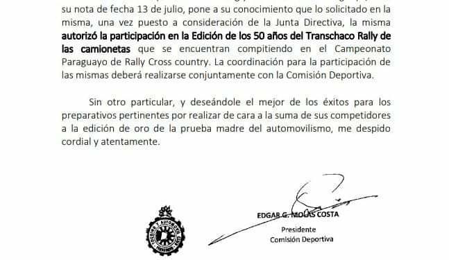 Los mismo accedieron al pedido de la Asociación Central de Motores Todo Terreno, la cual fue remitida el 15 de julio de este año, por lo que la edición 50 del Transchaco Rally contará con la categoría Camionetas, las cuales deberán coordinar su incursión en el evento con la Comisión Deportiva.
