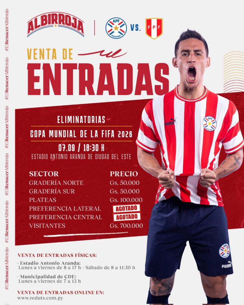 Este viernes, la cuenta oficial de la Selección Paraguaya informó que desde hoy se encuentran disponibles las entradas físicas para el compromiso ante Perú, los sectores del Preferencia Central y Lateral ya fueron vendidos por completo.