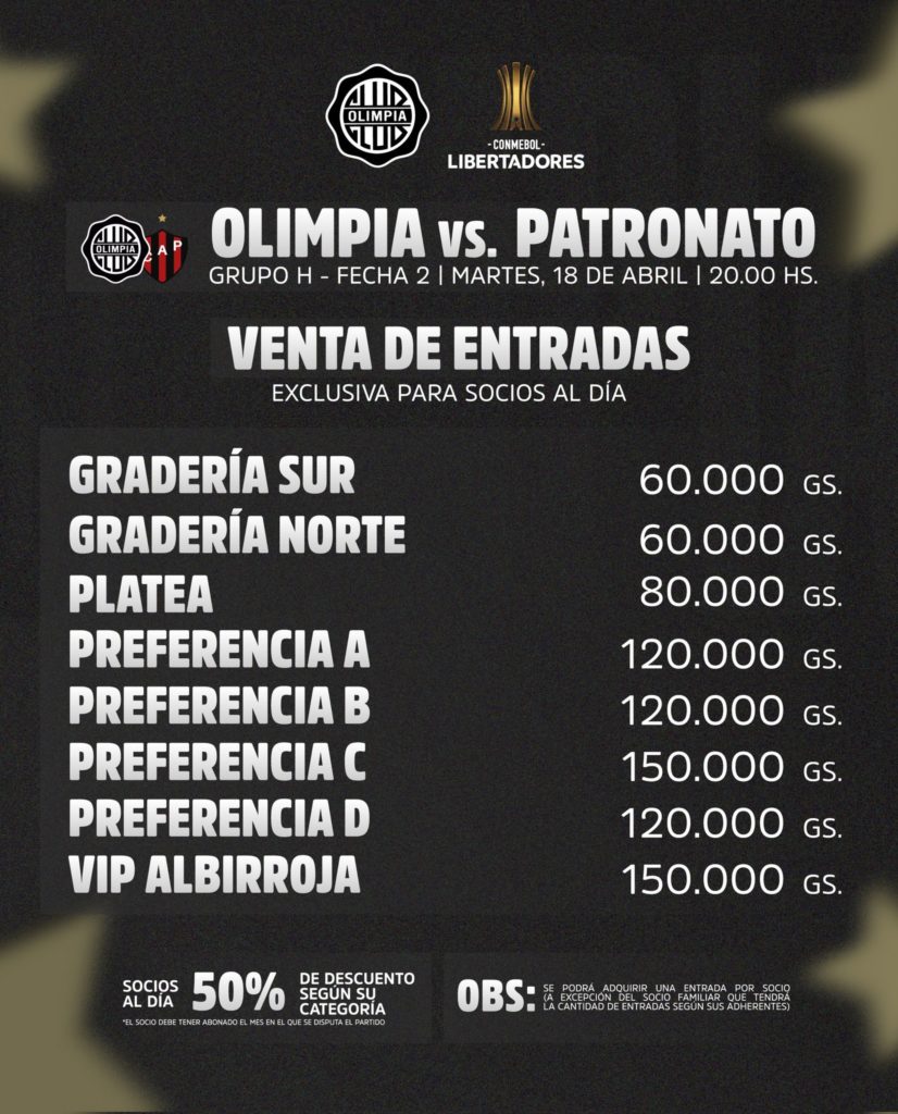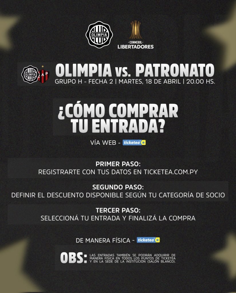 El primer partido de Olimpia en condición de local en la Copa Conmebol Libertadores será el próximo martes 18 de abril, enfrentando a Patronato, en el estadio Defensores del Chaco, desde las 20:00hs. La venta de entradas será exclusivamente para los socios al día de la institución.