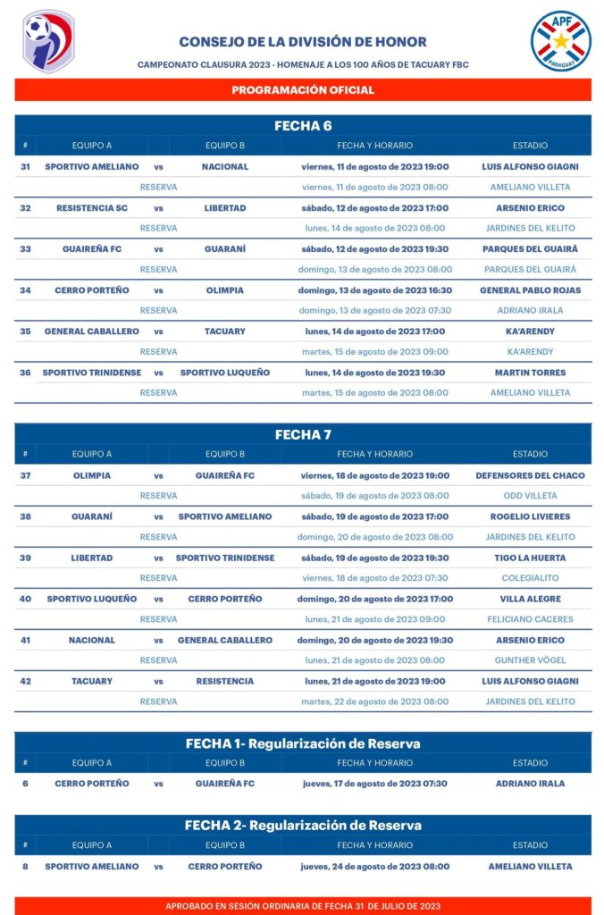 Mientras que en la séptima fecha encontramos que Olimpia recibirá a Guaireña en el estadio Defensores del Chaco el próximo viernes 18 de agosto. Sin embargo, el Sportivo Luqueño lleva el encuentro ante Cerro Porteño hasta el sur del país, dicho compromiso se disputará el domingo 20 de agosto en el estadio Villa Alegre.