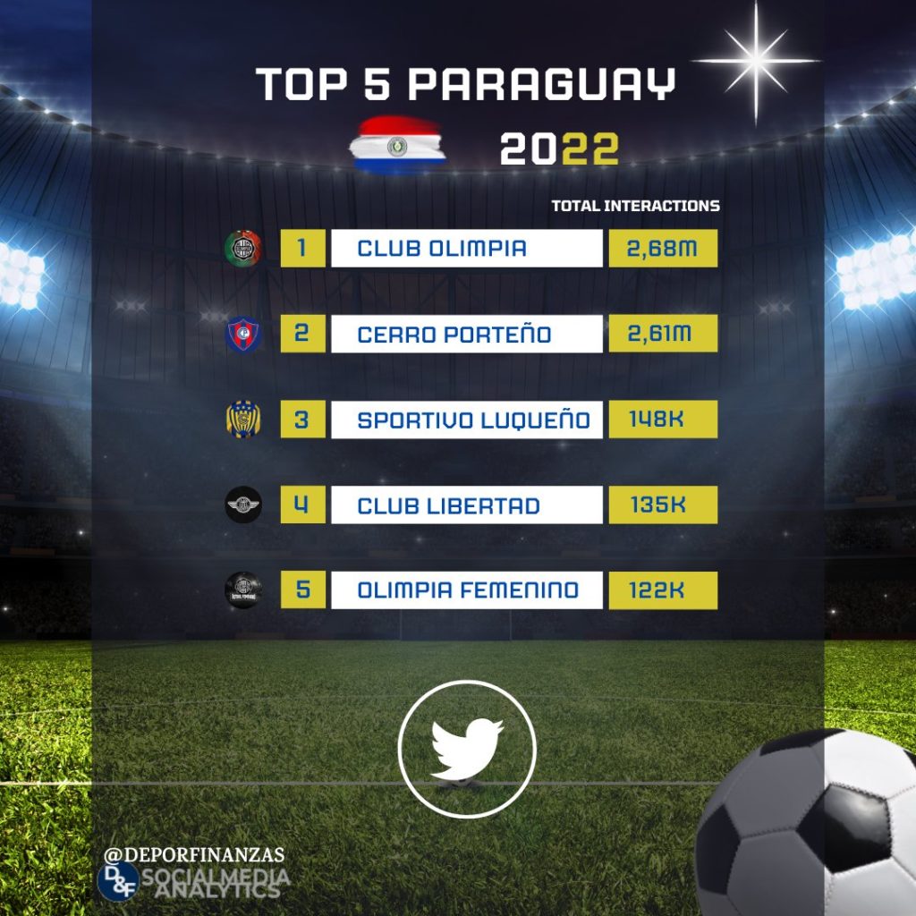 Completan el podio de los cinco clubes más populares en Twitter, Libertad, con 135 mil interacciones y la cuenta de Olimpia Femenino, con 122 mil. La gran ausencia en esta lista es sin duda Guaraní, uno de los clubes más tradicionales del fútbol paraguayo.