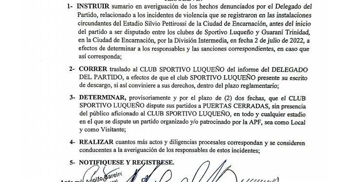 En el documento que publicó la Asociación Paraguaya de Fútbol, sugiere continuar con las investigaciones y buscar a los responsables de los enfrentamientos registrados en Encarnación. El próximo juego de Sportivo Luqueño será el domingo 10 de julio ante River Plate, en el Estadio Jardines del Kelito, desde las 10:00hs.