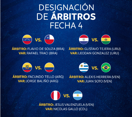 En la cuarta jornada del segundo combo de las Eliminatorias Sudamericanas fueron designados dos venezolanos para los duelos: Uruguay vs. Brasil y Perú vs. Argentina; un brasileño para Venezuela vs. Chile; un uruguayo en el juego Paraguay vs. Bolivia y un argentino en el encuentro Ecuador vs. Colombia.