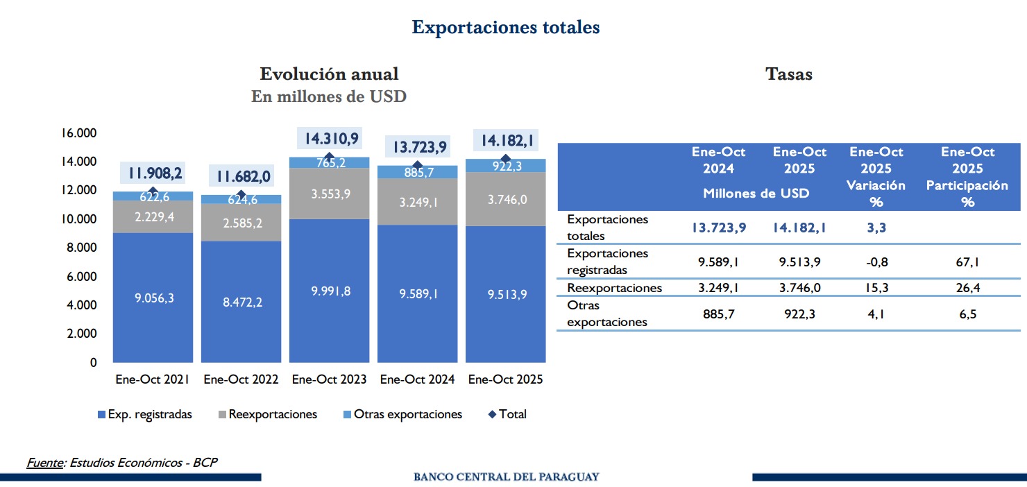 En contraste, las reexportaciones mostraron un notable dinamismo, con un aumento del 15,3%, alcanzando USD 3.746,0 millones y representando el 26,4% del total. Por su parte, las otras exportaciones sumaron USD 922,3 millones, con una expansión del 4,1%.