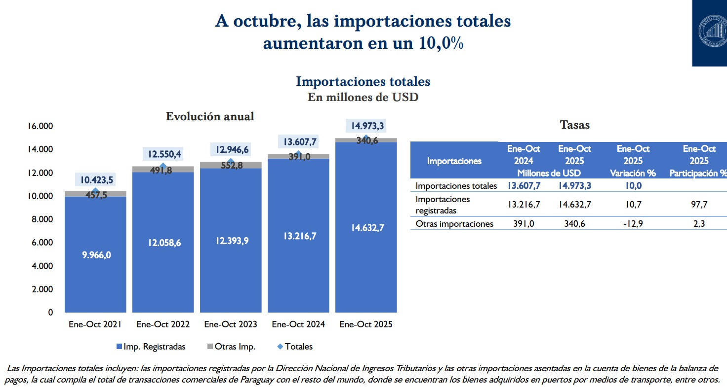 En cuanto a las importaciones, al cierre de octubre de 2025 totalizaron USD 14.973,3 millones, un 10,0% más que los USD 13.607,7 millones observados en 2024. Las importaciones registradas representaron el 97,7% del total, con USD 14.632,7 millones, mientras que las otras importaciones se redujeron en 12,9%, situándose en USD 340,6 millones. En términos de volumen, las compras externas aumentaron 10,6%.