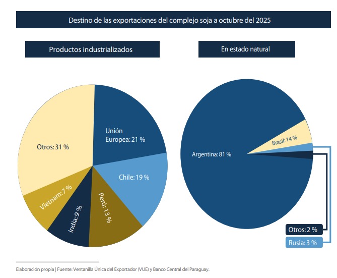 En contraste, la soja en grano llegó solo a 10 destinos, con una fuerte concentración: su principal mercado abarca más del 80% del total, lo que evidencia una mayor vulnerabilidad del modelo exportador de materia prima.