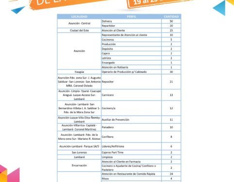 Los puestos de trabajo son para Asunción, Encarnación, Coronel Oviedo, Caacupé, Villarrica, Coronel Martínez y ciudades del departamento Central.