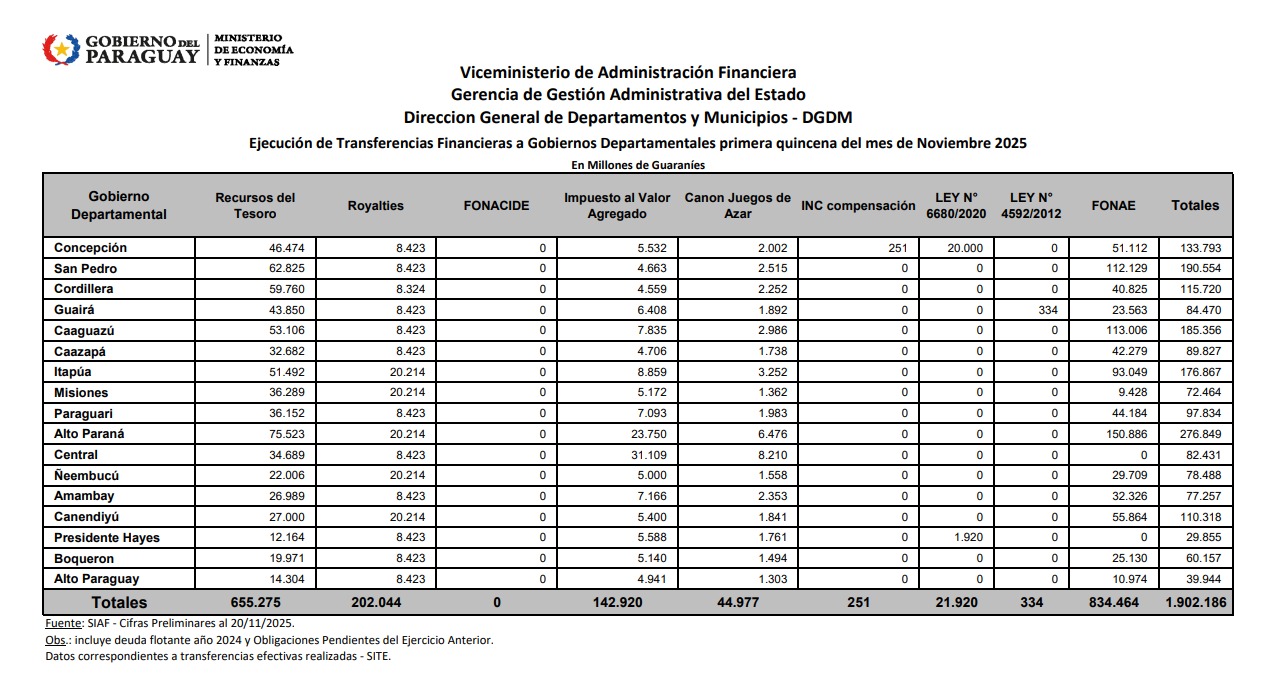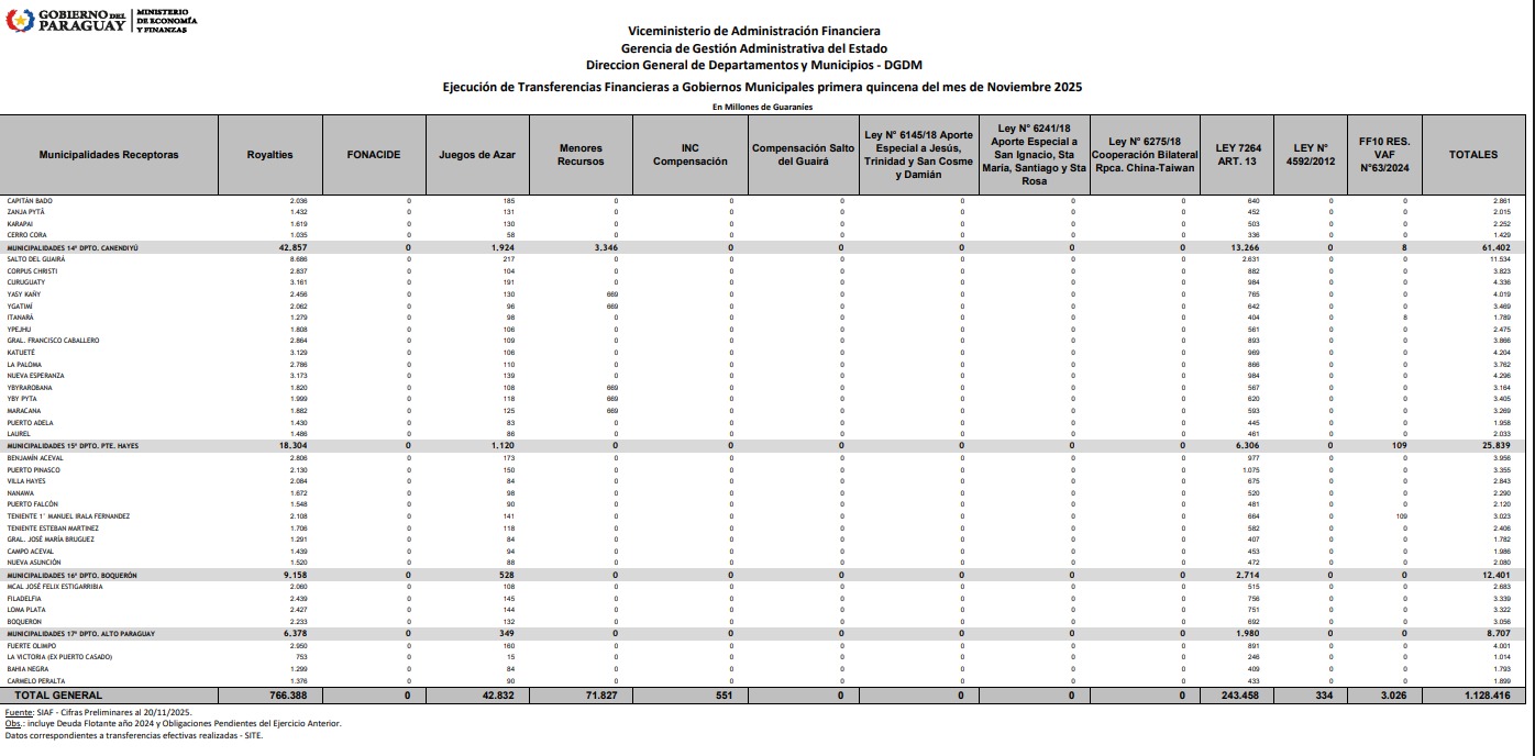 Según el informe de la Dirección General de Departamentos y Municipios (DGDM), las transferencias a la primera quincena de noviembre totalizaron G. 3.030.602 millones. De ese monto, las gobernaciones recibieron G. 1.902.186 millones, mientras que las municipalidades percibieron G. 1.128.416 millones.